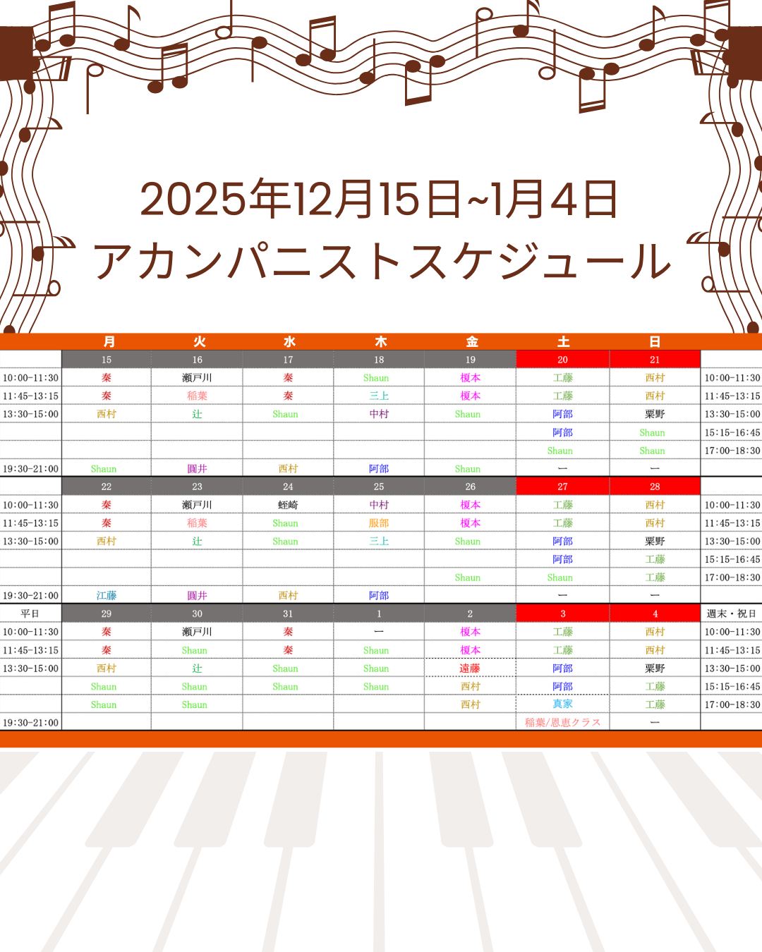 【12月15日-1月4日】ピアニストスケジュールを公開しました!