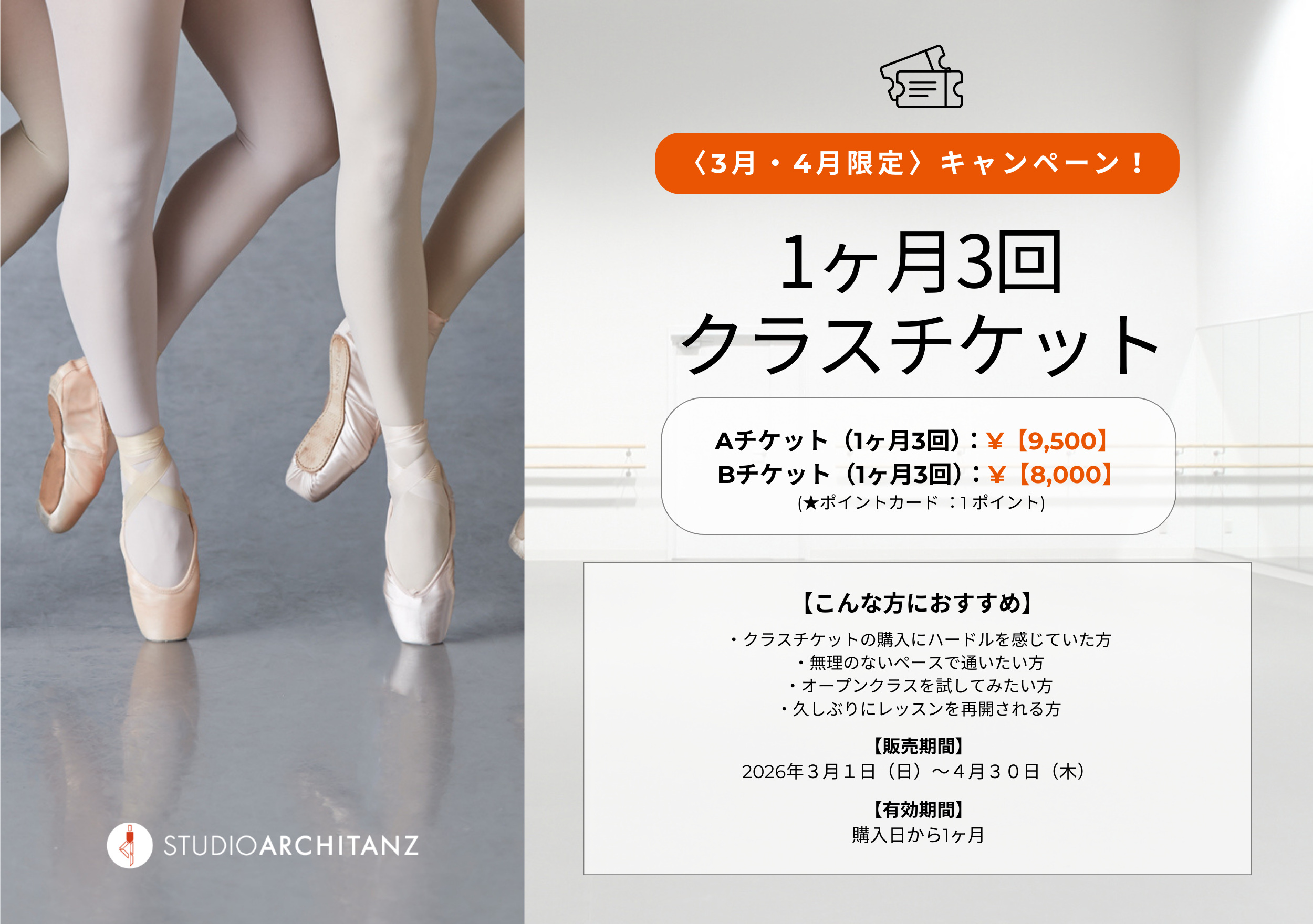 いつもアーキタンツをご利用いただき、ありがとうございます! 4月を迎え、新生活が始まる春。 生活リズムやスケジュールの変化に合わせて、「まずは無理なくクラスに通いたい」とお考えの方も多いのではないでしょうか? そこでアーキタンツでは、3月・4月限定キャンペーンとして「1ヶ月3回クラスチ…