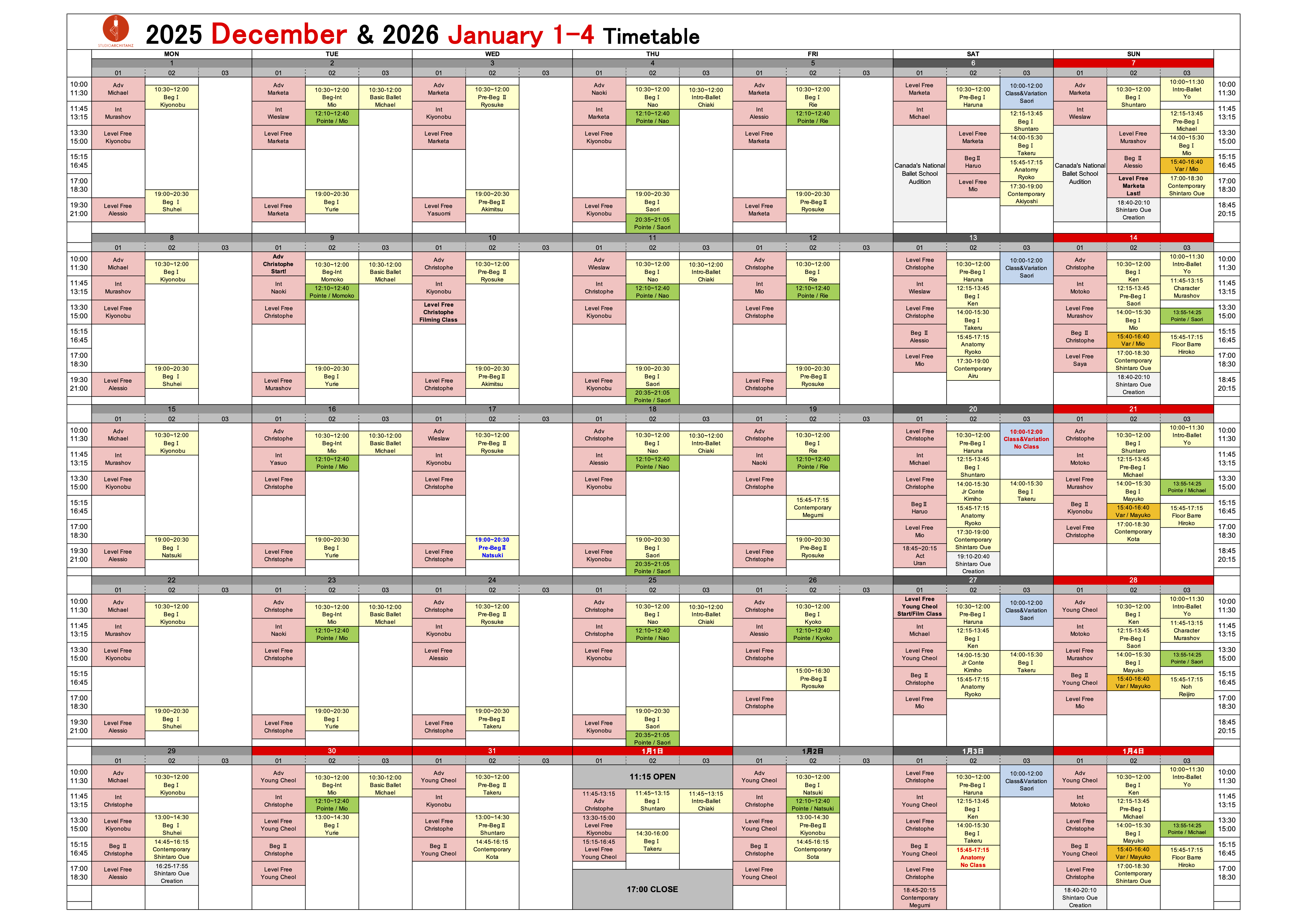 ・Time table is subject to change - Classes may be cancelled without prior notice.