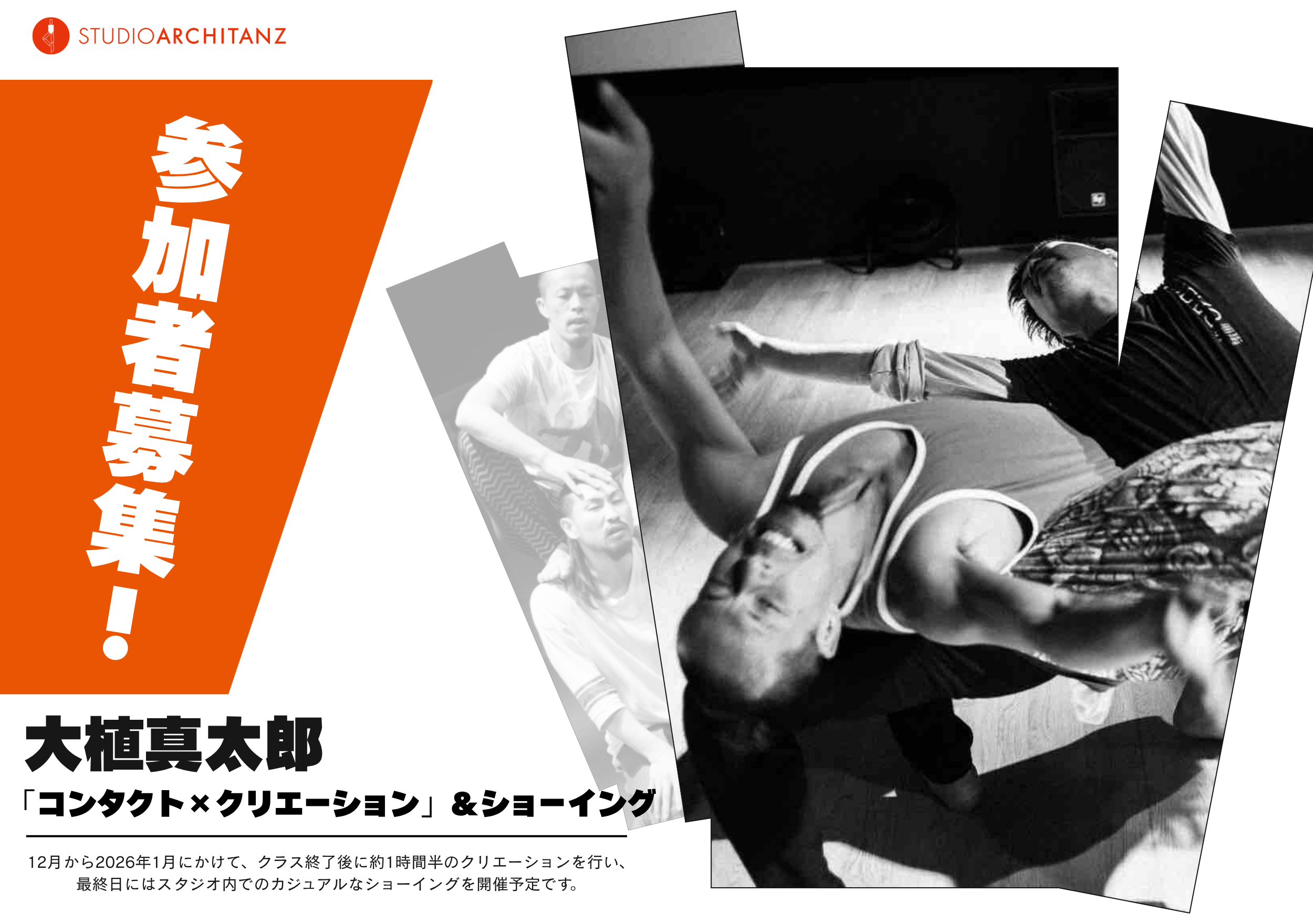 このたびアーキタンツでは、大植真太郎先生の『コンタクトテクニック』クラスでの学びをさらに深める場として、「コンタクト×クリエーション」&ショーイングを開催いたします。 コンタクトを通して得た感覚や気づきをそのまま創作へとつなげ、他者との関わりの中から生まれる「今、この瞬間の表現」を一緒に形にしていくことを目的としています。 12月から2026年1月にかけて、クラス終了後に約1時間半のクリエーションを行い、最終日にはスタジオ内でのカジュアルなショーイングを開催予定です。