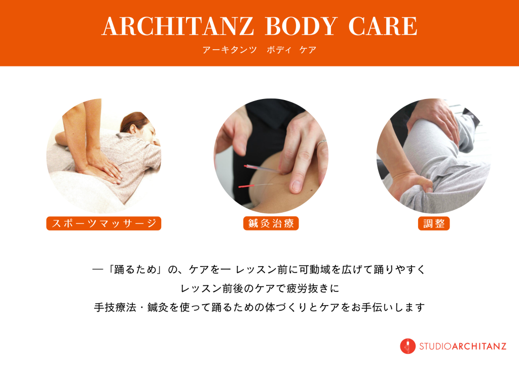 アーキタンツでは、毎週月曜日・木曜日、そして隔週金曜日に、麻布十番のLoople治療院からトレーナーの方に来ていただきスポーツマッサージ&鍼治療を開催しております。