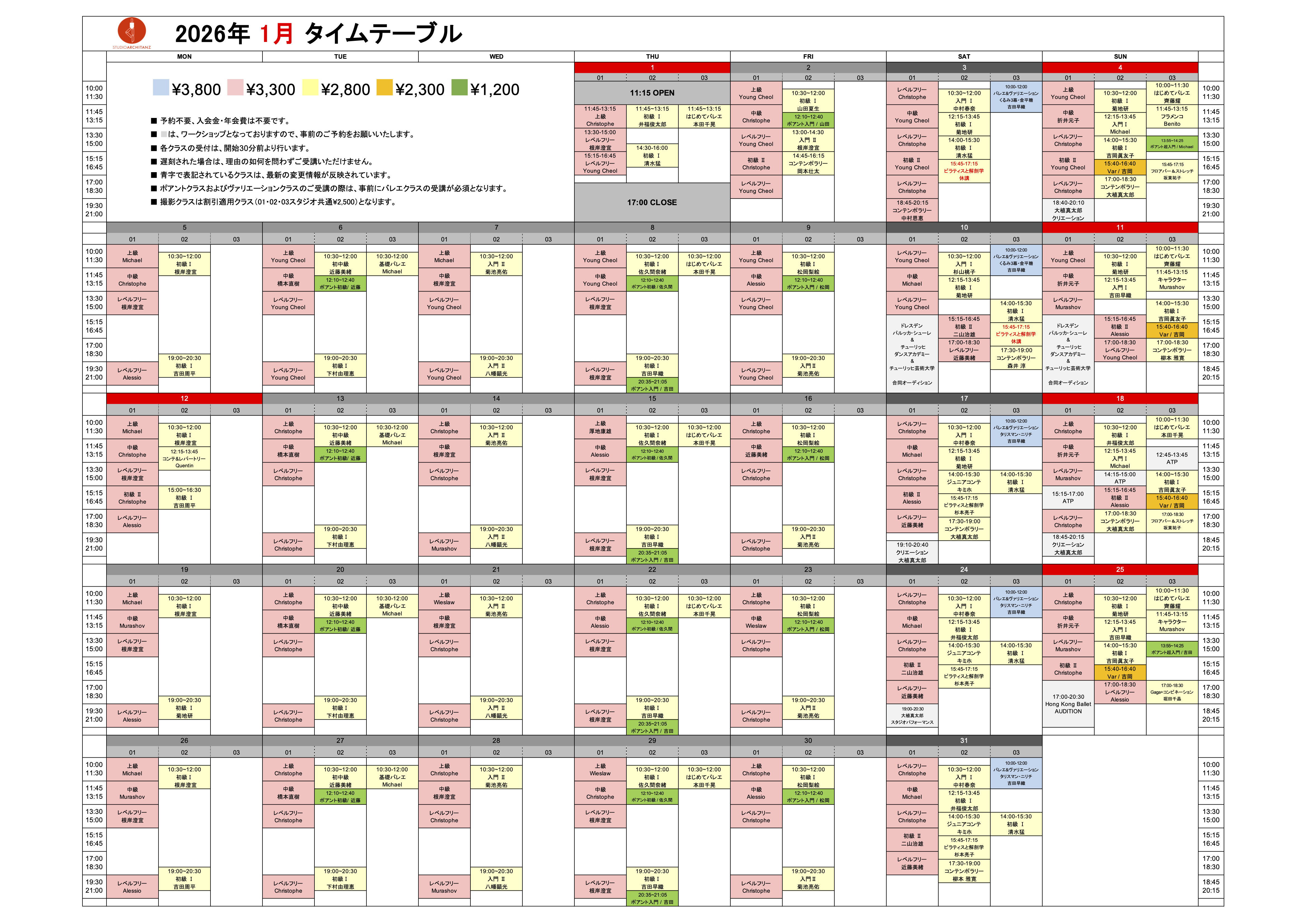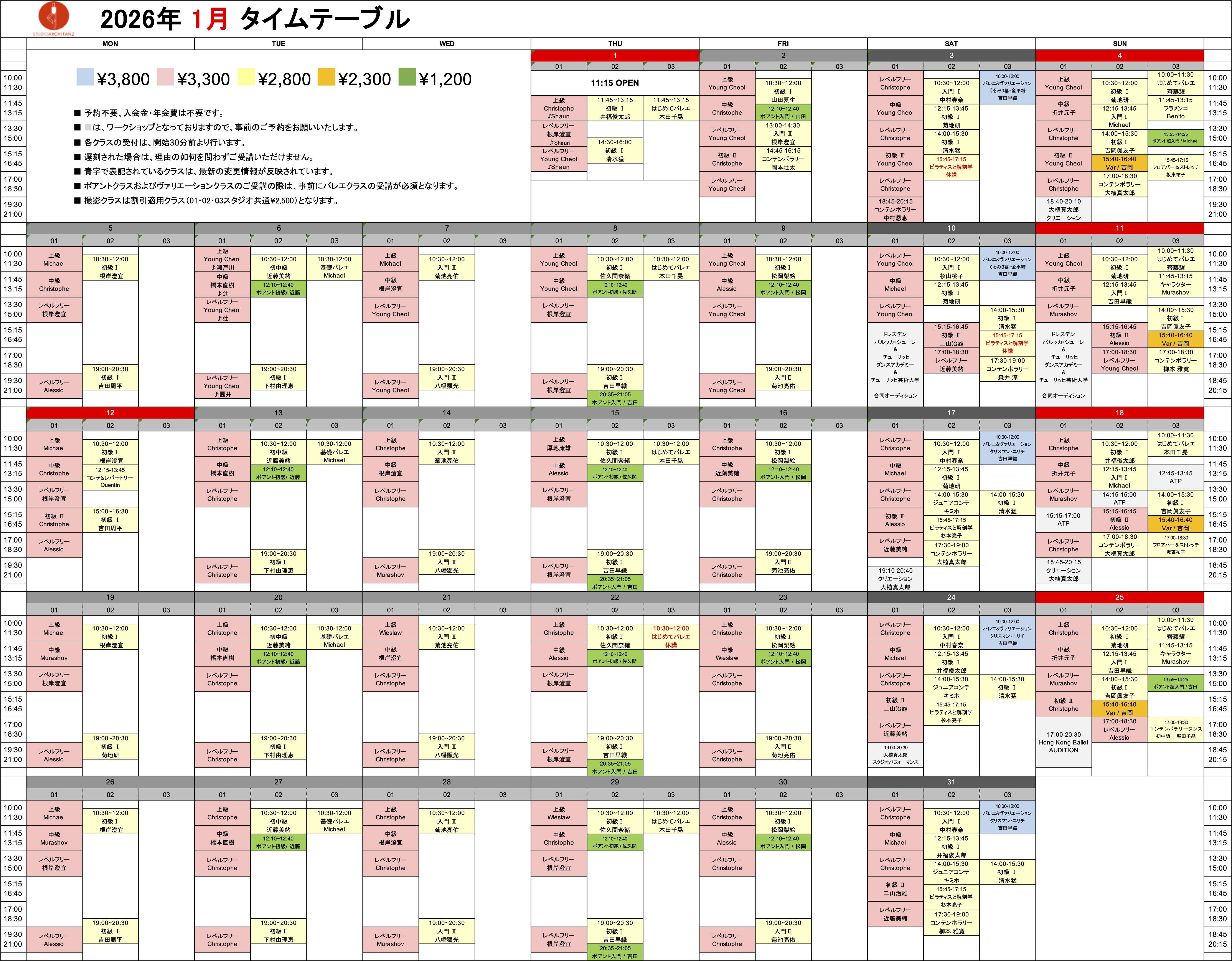 2026年1月のタイムテーブル