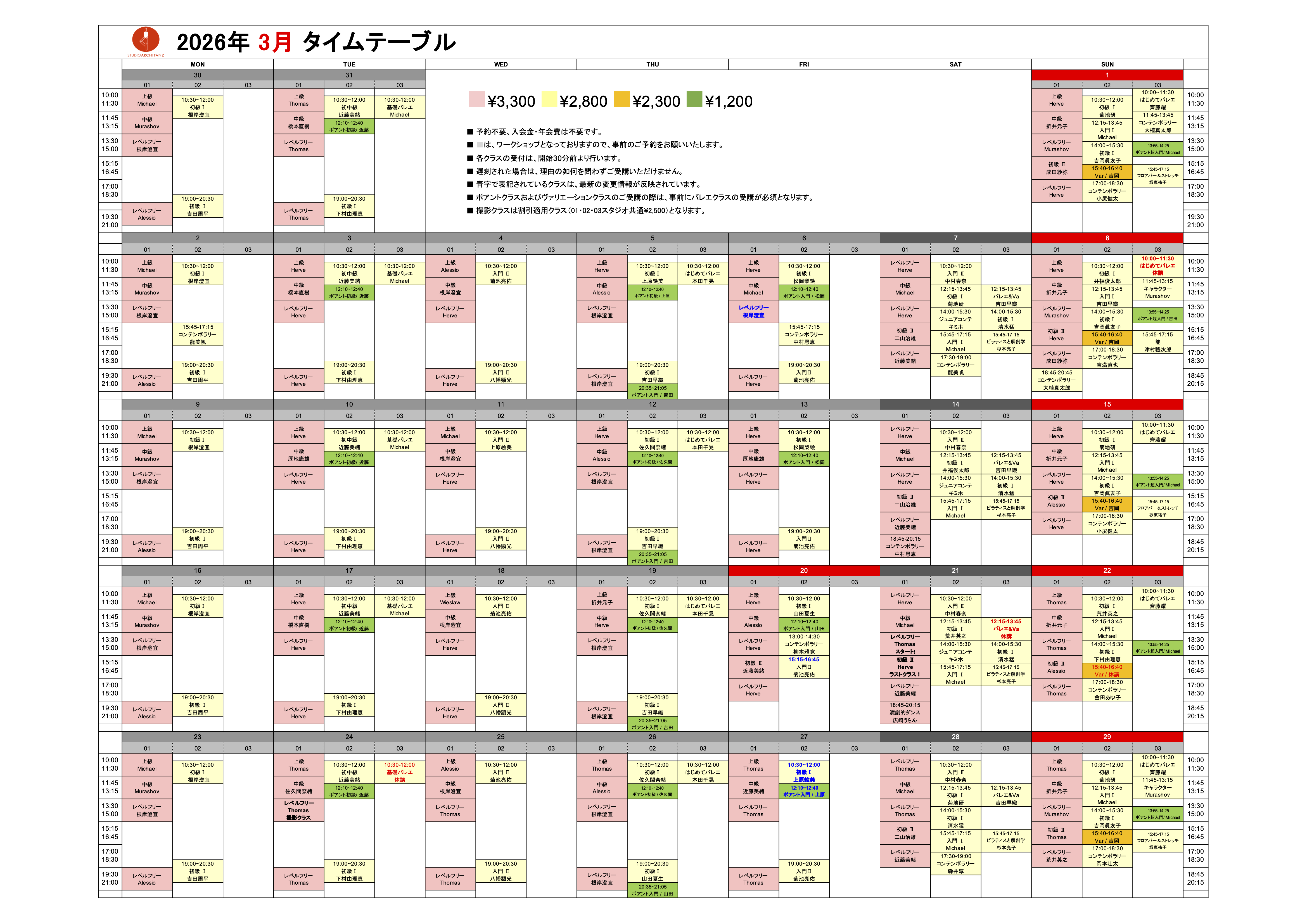 2026年3月のタイムテーブル